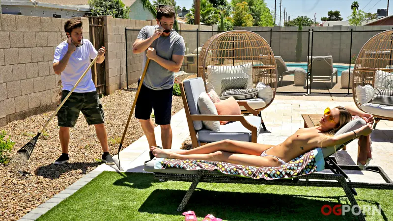 Adira Allure is a teacher at a local school, and she has quite the reputation for sleeping with her students. Jay Romero and Kyle Mason are surprised when Ms. Allure is the landscape customer they’ve been sent to service. They do their best not to be perverts, but it’s just so hard when Ms. Allure struts outside in an itty bitty bikini to sunbathe. Speaking of hard, both boys are rock hard after Ms. Allure decides to take off her bra for some topless sunbathing. They try to look away and not get caught, and they’re both very relieved when Ms. Allure goes inside.Too bad that Ms. Allure only relocated because she was really, really warm. Kyle and Jay can see her through the bedroom blinds, and they really can’t help but stare. When Ms. Allure notices them, she beckons for the boys to come inside. They do, but they’re surprised when their teacher tells them to take off their pants for her. She insists that they both jack off in front of her. Although the boys are hesitant, they do as teacher tells them. Imagine how pleased they are when Ms. Allure makes it clear that she’ll be helping them out on the road to getting off.Dropping to her knees, takes one cock in each hand. She keeps on stroking with the off hand as she brings first one and then the other dick to her mouth to start sucking. After proving that she can handle herself giving oral pleasure to two cocks at once, Ms. Allure climbs onto the bed to show that she can pleasure them both at the same time, too. While Kyle enjoys the full force of Ms. Allure’s attention with her hands and mouth, Jay gets to tap that in doggy. Then Ms. Allure hops onto Kyle’s big dick for a stiffie ride in her cream filled fuck hole. As she rides, Ms. Allure keeps on sucking so Jay stays hard and ready for his next act. On her back, Ms. Allure lets both boys have at it one last time as she blows the other. While Kyle cums inside Ms. Allure’s mouth, Jay gets to glut her with a creampie of love that dribbles from her pussy when Jay pulls out.